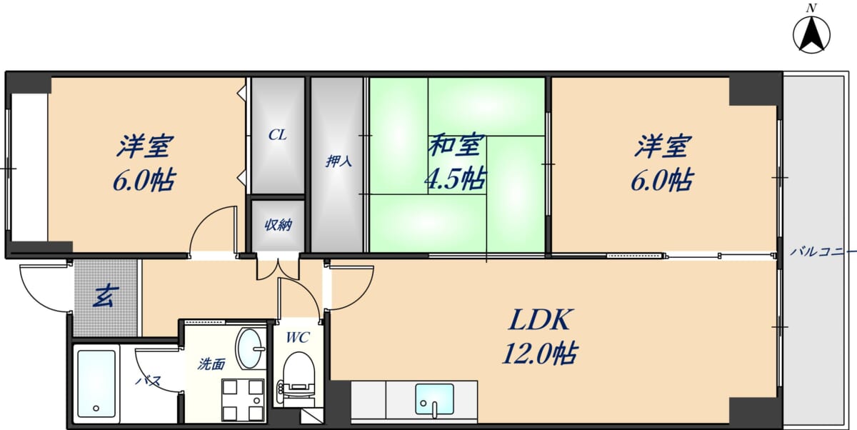 12帖の広々としたLDKは、家族が自然と集まる中心的な空間です。キッチンは壁付けタイプで調理スペースを効率的に確保でき、リビング側とのつながりも感じられる造りになっています。東向きの窓からは朝日が差し込み、朝の時間帯には室内が心地よい光で満たされます。日常の食事やリビングでのくつろぎが、一層快適になる環境です。両サイドに配された2つの洋室は、それぞれ6帖と十分な広さを確保してり、1つはリビングと隣接しているため、子供部屋やワークスペースとしても使いやすく、もう1つはバルコニーに面しているため寝室に最適です。東からの光が入るため、朝の目覚めも気持ちよくスタートできます。
