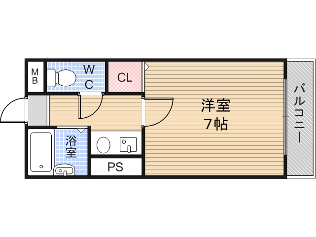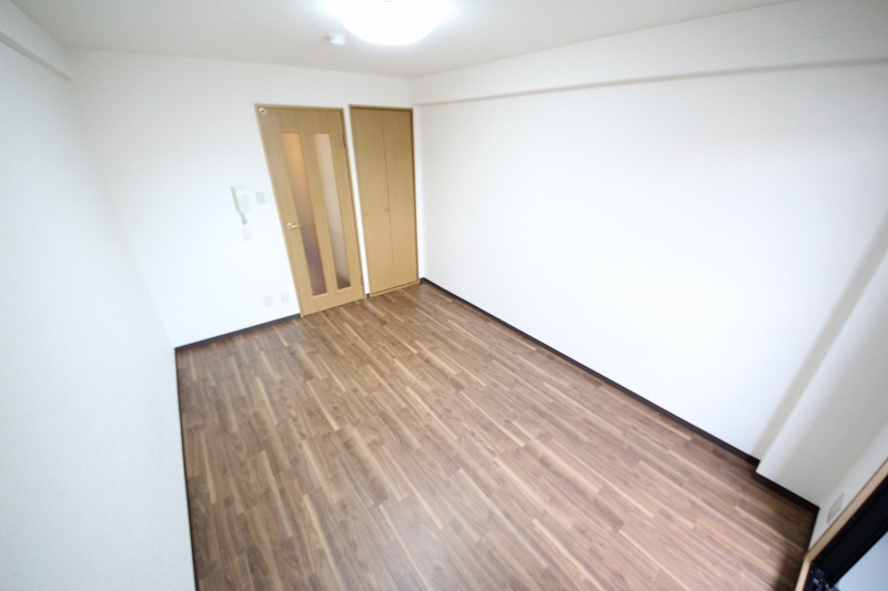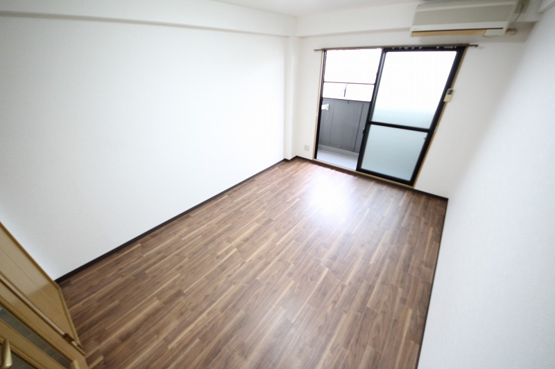 居室は7畳の1Kタイプで、シンプルながらも落ち着いた空間が広がります。東向きなので朝日が差し込み、一日の始まりを心地よく迎えられます。木目のフローリングは少し暗めで、どんなインテリアにも相性が良いです。壁面には照明や小物を置くスペースも十分にあり、自分好みの空間づくりが可能です。
