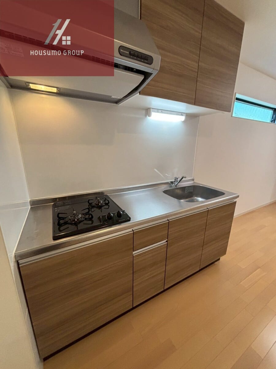 壁付きキッチンはシンプルながら作業動線が短く、2口ガスコンロ完備で同時調理が可能なので、料理がはかどります。上下の収納に加え、調理スペースも十分に確保されており、一度に複数の料理を作ることも可能です。南向きのリビングとつながるため、料理をしながらでも会話を楽しめるのが魅力です。