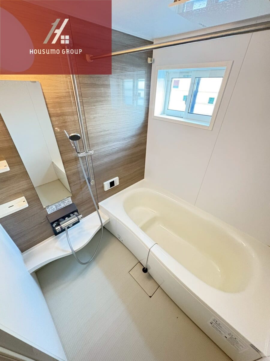 一日の疲れをしっかりほぐしてくれる、ゆったりサイズのバスルームは、足を伸ばして浸かれる広さがあるため、シャワー派の方はもちろん、湯船にゆっくり浸かりたい方にもぴったりです。また、小窓が備わっているので、自然光が入りやすく、湿気がこもりにくいのも大きな魅力で、換気がしやすくカビ対策にも効果的で、毎日のお手入れがぐっと楽になります。明るさと開放感を兼ね備えた、使い心地の良いバスルームです◎