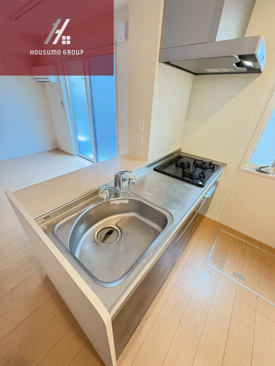 LDKとの一体感を感じられるカウンターキッチンは、ひとり暮らしはもちろん、カップルの同棲にもぴったりです。調理スペースもしっかりと確保されているので、食材の仮置きや盛り付けがしやすく、料理をしながらリビングの様子を見守れる開放感もポイントです。収納がしっかりあるため、調味料やキッチンツールをまとめやすく、日々の料理がスムーズになります。また、すぐ横に小窓があるのですぐに換気ができるので清潔感も保ちやすいです◎