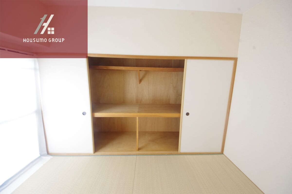 収納は和室と洋室の両方に備わっており、住まい全体の使い勝手をしっかり支えてくれます。和室には奥行きのある押し入れがあり、布団や季節家電などの大きめの荷物もゆったり収まる頼もしさが魅力。洋室には コンパクトながら日常使いにちょうどいいクローゼット が設置され、衣類や小物を整理しやすい仕様になっています。用途に応じて収納場所を使い分けでき、生活空間をすっきり保ちやすい間取りです◎