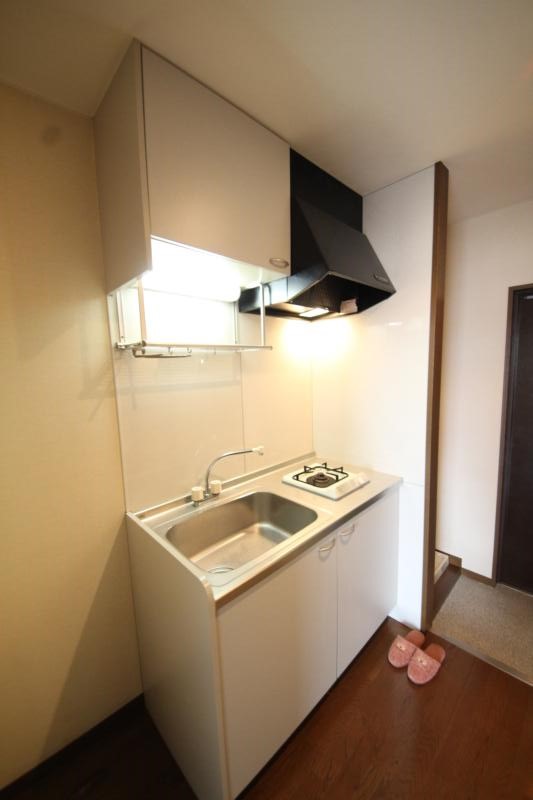 コンパクトながら調理がしやすいキッチンは、収納スペースもしっかり確保されているため、調味料や調理器具をスッキリまとめられます。自炊派の方でも日々の料理がスムーズに進む使い勝手の良さがポイントで、上部に吊り戸棚もあるため、日常使いの食器を置くのにピッタリです。居住空間とキッチンの距離感も程よく、生活感が出すぎない整った印象のお部屋です◎