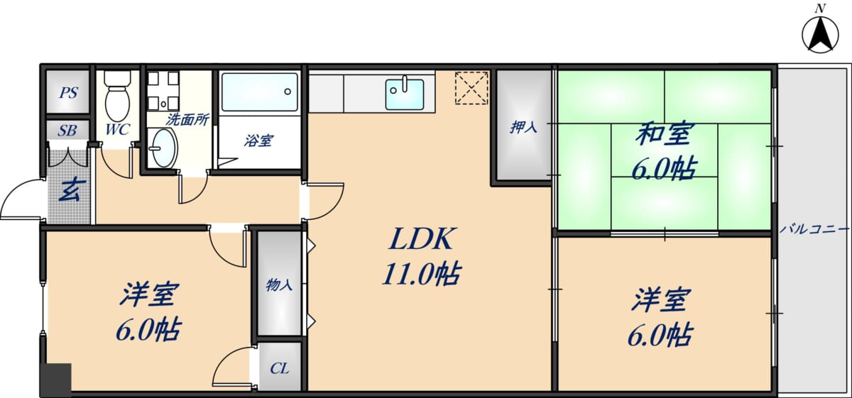 住まいの中心となるLDKは11.0帖と、3LDKとしてはバランスの取れた広さ。キッチンからリビング全体を見渡せる配置のため、家族の様子を感じながら家事ができる点が魅力です。ダイニングテーブルとソファを分けて配置しても圧迫感が出にくく、生活動線をしっかり確保できます。また、和室・洋室の双方にアクセスしやすい間取りのため、家族構成の変化にも柔軟に対応できるのがポイント。築年数は経っていますが、その分「部屋の独立性」と「実用性」を重視した間取りです◎