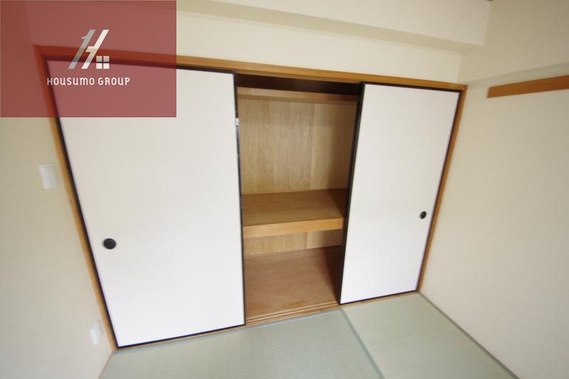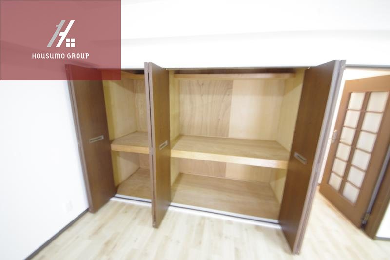 LDK内に設けられた大容量の押し入れは、掃除道具から日用品、ストック品まで“使う場所の近く”にまとめて収納できます。奥行きのある押し入れタイプのため、衣装ケースや収納ボックスを組み合わせることで、見た目以上の収納力を発揮。季節家電や来客用の座布団・布団類も無理なく収まり、LDKをすっきり保てます。各居室とは別にリビング収納が確保されているため、「収納は各部屋だけでは足りない」というファミリー層にも嬉しい設計。生活動線と収納力を両立した、暮らしやすさを支えるポイントです。