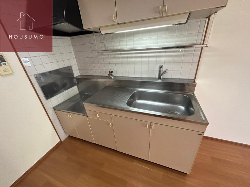 LDKに設置されたキッチンは壁付きですが、ダイニングとの距離も近く、料理をしながら家族との会話やテレビを楽しむことができ、コミュニケーションの取りやすさが魅力です。コンロは自分で設置するタイプとなっているため、ガスコンロ・IHなどライフスタイルや好みに合わせて自由に選べます。上部に吊り戸棚もあるため、日常使いの食器を置くのにピッタリです。