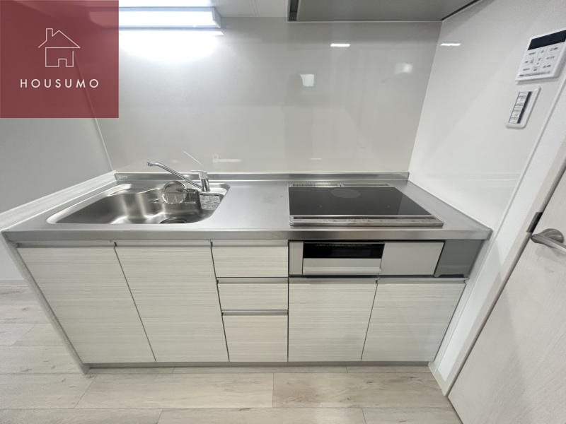 キッチンには2口IHコンロに加えてグリル付き。火を使わないIH仕様のため、安全性が高く、お掃除がしやすいのも嬉しいポイントです。2口あることで同時調理が可能となり、平日の時短調理から休日のしっかり自炊まで幅広く対応。さらにグリル付きのため、焼き魚やグラタンなど、ワンランク上の料理も手軽に楽しめます。LDK空間と調和したキッチンデザインで、生活感が出にくく、1LDKらしいすっきりとした住空間を演出します。