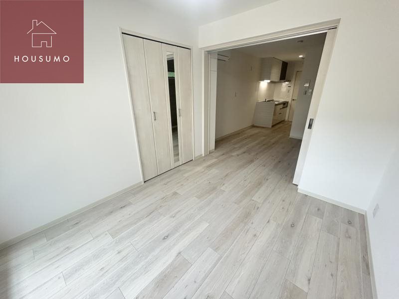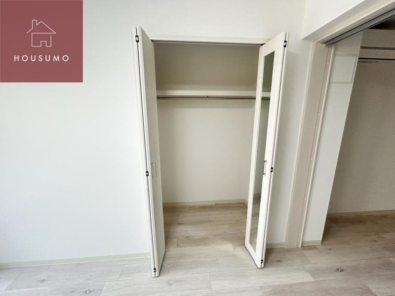 収納は奥行きがしっかり確保され、内部に横幅もある設計のため、衣類はもちろん、季節物や収納ケースまでまとめて収まります。ハンガーパイプを活用すれば、コートやワンピースなど丈のある衣類もすっきり収納可能。扉の外側には全身鏡が設置されており、外出前の身だしなみチェックもこの場で完結します。鏡を別途置く必要がないため、居室空間を広く使える点も嬉しいポイントで、収納力と実用性を兼ね備えた、一人暮らしにちょうど良い収納スペースです◎