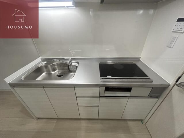 キッチンはシステムキッチン仕様で、調理スペースと作業動線がしっかり確保された実用的なレイアウトです。IHコンロを採用しているため、火を使わず安全性が高く、掃除もしやすいのが特徴。上下に収納スペースがあり、調理器具や食器、ストック類までまとめて整理しやすくなっています。生活感が出やすいキッチン周りもすっきり保ちやすく、料理をする方にも自炊派の方にも使いやすい空間です。1LDK賃貸で機能的なキッチンを重視する方におすすめできるポイントです。