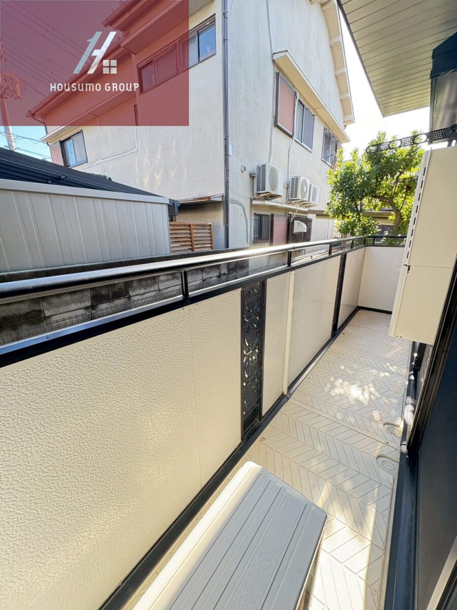 バルコニーは奥行きがあり、洗濯物や布団もしっかり干せる実用的な広さです。手すり部分は目隠しパネル付きで、外からの視線をやわらげつつプライバシーにも配慮されています。床は清潔感のあるデザインで、日常のお手入れもしやすい仕様です。周囲の建物との距離もあり、圧迫感が少なく開放的な印象を受けます。ちょっとした外気浴や植物を置くスペースとしても活用できる、使い勝手の良いバルコニーです。