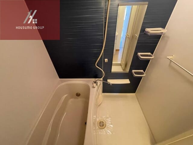 バスルームは、深みのあるダークブラウンのアクセントパネルが高級感を演出する、シックで落ち着いた空間です。 ゆったりと肩まで浸かれる広々とした浴槽には追い焚き機能が完備されており、いつでも温かいお風呂で一日の疲れを癒やすことができます。 天候を気にせず洗濯物を乾かせる浴室乾燥機も備わっているため、湿気がこもりにくく、バスルームを常に清潔に保てるのが魅力です。 洗い場には使い勝手の良い縦型の大きな鏡と、シャンプーなどを整理できる3段の収納棚が設置されており、機能面も充実しています。 手すり代わりにもなるスライドバー式のシャワーなど、細かな使い心地まで配慮された設計となっており、快適なバスタイムを約束してくれるお部屋です。