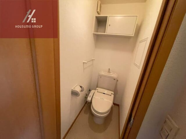 トイレは、温水洗浄便座が完備された清潔感のある空間です。 明るいホワイト系の壁紙に、ナチュラルな木目調の扉や枠材が組み合わされており、お部屋全体と統一感のある落ち着いた雰囲気に整えられています。 背後には手洗い場付きのタンクが設置されているため、使用後すぐに手を洗うことができる効率的な設計です。 壁面にはタオル掛けやペーパーホルダーも使いやすい位置に配置されており、毎日快適に利用できます。 上部には扉付きの吊戸棚があり、トイレットペーパーのストックや掃除用具などをスッキリと隠して収納できる、機能的なお部屋です。