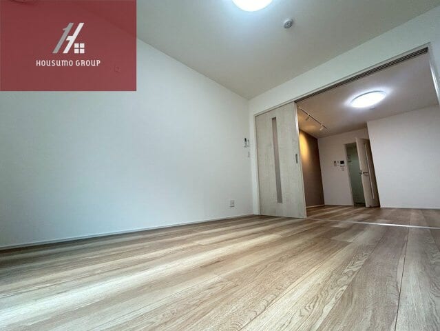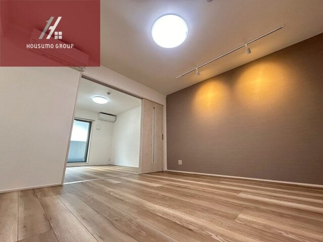 洋室はリビングとスライドドアで仕切られており、扉を開放することでより広々とした一体感のある空間として活用できます。落ち着いた色合いのアクセントクロスが施された壁面には、お洒落なライティングレールが設置されており、お好みの照明で自分好みの雰囲気を演出可能です。明るい木目調のフローリングが室内全体に温かみを与え、大きな窓からは自然光がたっぷりと差し込む明るい印象を与えてくれます。エアコンが完備されているため入居したその日から快適に過ごせるほか、室内物干し設備も備わっており、雨の日の洗濯にも困りません。新築ならではの清潔感と機能的な設備が整った、寝室としても趣味の部屋としても心地よく過ごせるプライベート空間です。