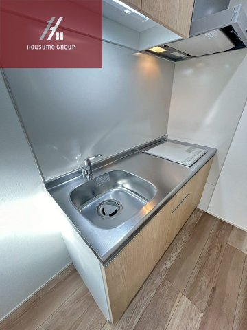 キッチンは木目調のパネルがナチュラルな雰囲気を演出する、清潔感あふれるシステムキッチンです。2口のIHコンロを採用しているため、火を使わず安全にお手入れも簡単に行うことができます。シンクとコンロの間には調理スペースが確保されており、効率よくお料理を楽しめる設計です。上部と下部には機能的な収納棚が備わっており、調理器具や食器類をすっきりと整理できます。手元の照明が明るく照らしてくれるため、夜間の作業もスムーズに行える機能的な空間となっています。