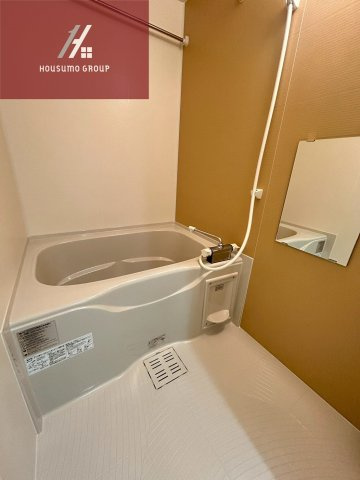 バスルームは、暖かみのあるベージュのアクセントパネルが落ち着いた空間を演出しています。ゆったりと浸かれる浴槽に加え、洗い場も使い勝手の良い広さが確保されており、毎日の疲れをリラックスして癒やすことが可能です。壁面には鏡や小物を置けるラックが設置されているため、バスグッズを整理して清潔に保てます。浴室乾燥機が完備されており、天候を気にせず洗濯物を乾かせるほか、冬場の予備暖房としても重宝する便利な仕様です。新築ならではの最新設備が整った、日々の生活を快適にサポートしてくれる空間となっています。
