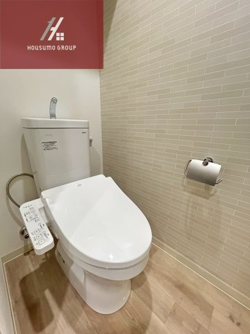 トイレは白を基調とした清潔感のある空間で、温水洗浄便座が完備されています。壁面にはタイル調のアクセントクロスが施されており、スタイリッシュな雰囲気を演出しています。手洗い付きのタンクを採用しているため、限られたスペースを有効に活用できる機能的な設計です。床面は掃除がしやすいフローリング調の素材となっており、日々の衛生管理も手軽に行えます。シルバーのペーパーホルダーなど細かな設備にもこだわりが感じられる、新築ならではの心地よい空間です。