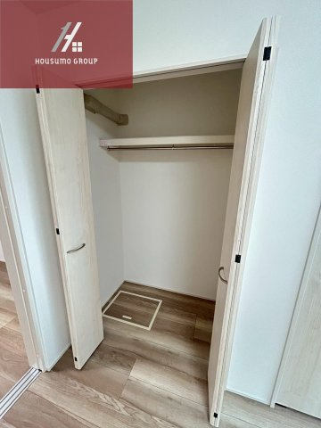洋室に設置されたクローゼットは、ハンガーパイプと上部の棚を備えており、衣類や小物を効率よく整理できます。奥行きがしっかり確保されているため、厚手のコートやかさばる荷物もスムーズに収納可能です。白を基調とした扉が壁面と一体化しており、閉じることで生活感を隠して室内をすっきりと見せてくれます。床面は居室と同じ明るい木目調のデザインで統一されており、扉を開けた際も清潔感のある印象です。限られたスペースを最大限に活用できる機能的な収納で、お部屋を広く快適に保つことができます。