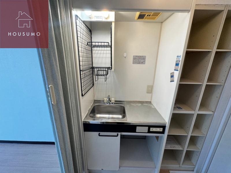玄関すぐに配置されたコンパクトキッチンは、ワンルームにちょうどいいサイズ感。シンクと作業スペースがバランスよくまとまり、日々の自炊にも対応できます。コンロは自分で設置するタイプのため、IH・ガスなどお好みやライフスタイルに合わせて選択可能。初期費用を抑えたい方も、使い慣れたコンロを持ち込みたい方にも柔軟に対応できます。さらにキッチン横には収納棚があり、調味料や食器、ストック品の整理に便利。限られた空間を有効活用できる、機能的なキッチンスペースです◎